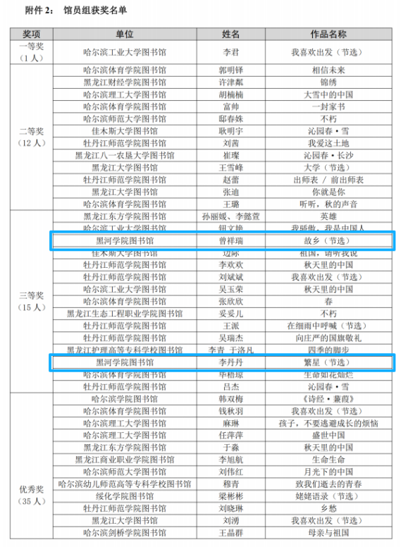 此次佳绩的取得,既是参赛师生刻苦备赛、实力角逐的成果,也是我校图书馆致力于校园文化建设、推动全民阅读的生动实践。未来,图书馆将继续加强资源整合与平台建设,进一步与各二级学院深度融合,持续增强“三全育人”实效性,为打造我校教育向北开放新高地提供更多助力。