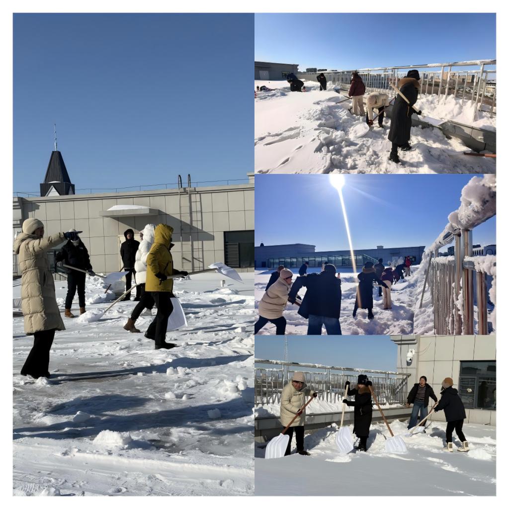 为筑牢安全防线,馆领导带队开展全覆盖安全巡查,排查消防、用电、监控等设施隐患等。北疆初春,一场场大雪为图书馆楼体带来沉重压力,馆员们不畏春寒积极清理楼顶积雪冰棱,减轻棚顶压力、消除融雪漏水、坠冰风险,守护楼宇与师生安全。