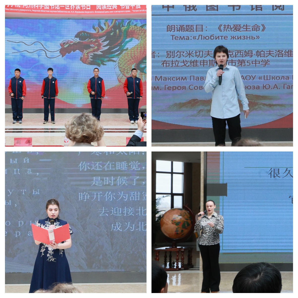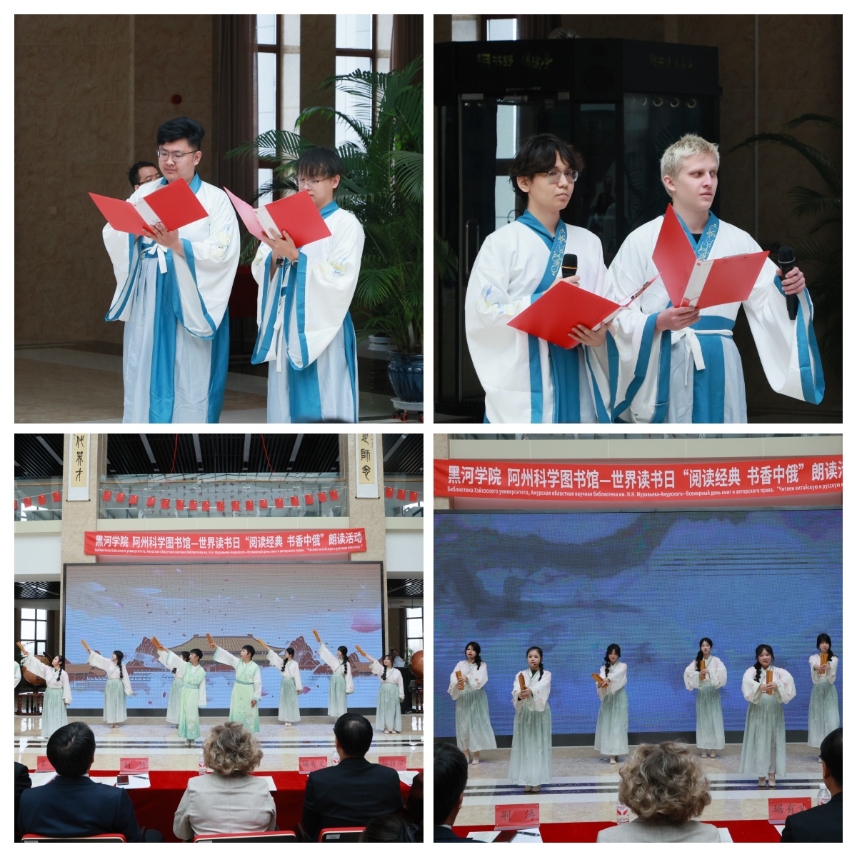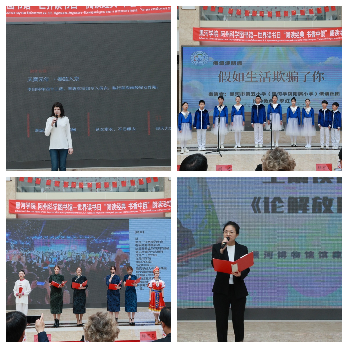 4月23日,正值第31个“世界读书日”,“阅读经典 书香中俄”第三届中俄图书馆阅读推广活动在我校图书馆成功举办。本次活动由校图书馆、共青团黑河学院委员会、俄罗斯阿穆尔州科学图书馆联合主办,武汉鼎森电子科技有限公司(博看数据库)、黑龙江超星信息技术有限公司、黑河市第五小学、黑河市老年大学、黑河市第四中学、黑河博物馆、黑河学院外国语学院、黑河学院国际教育学院、黑河市朗读者沙龙、黑河市欧美同学会予以协办。活动采用线上线下同步、中俄双语展演的形式,续写了两国图书馆文化交流的崭新篇章。