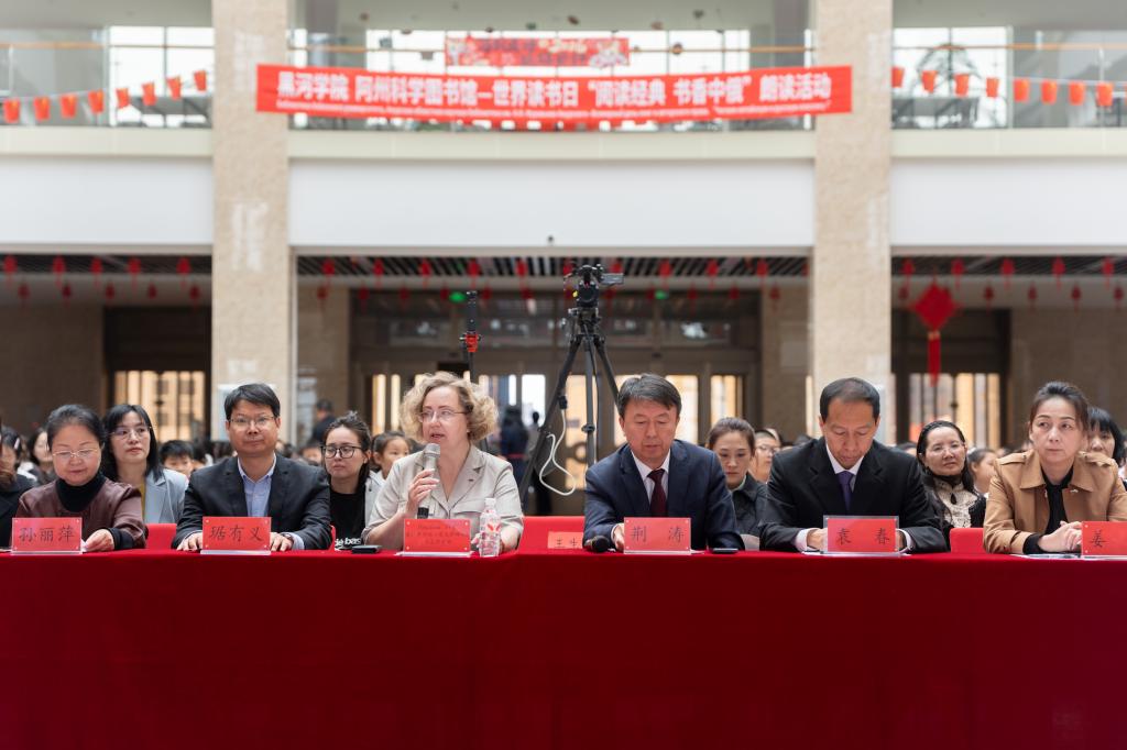 开幕式上,学校党委委员、副院长荆涛致辞,他表示,“阅读经典 书香中俄”双语朗读活动历经三年深耕,已成为中俄图书馆联盟框架下的特色文化交流品牌,学校将依托平台优势,持续深化与俄罗斯阿穆尔州科学图书馆等机构合作,以阅读为纽带促进中俄文化互鉴,为增进两国人民世代友好贡献高校力量。阿穆尔州科学图书馆馆长普拉斯科娃·奥克桑娜·谢尔盖耶夫娜表示,本次阅读推广活动在促进中俄文化交流、增进两国人民友谊方面发挥了重要作用,期待以多年合作成果为坚实基础,持续深化中俄两国在图书馆现代化建设、阅读文化推广、数字资源共建共享、人才交流培养等领域的全方位务实合作,推动中俄图书馆界交流合作迈向更高水平。