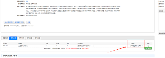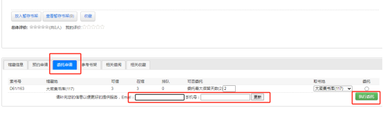 3.选定所要委托的书刊,点击委托申请,补充邮箱及手机号信息。如图书符合借阅规则,委托申请选项下会显示委托最大保留天数,以及该书在该馆藏地的可借数量,在馆数量,排队人数等,反之会显示未找到借阅规则不能委托。目前仅有大密集书库(117)可进行委托借阅;