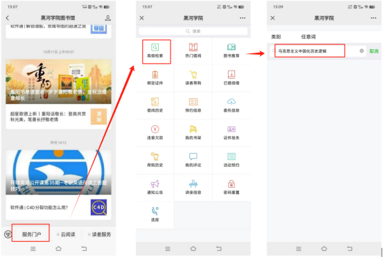 1.进入黑河学院图书馆微信公众号——服务门户——高级检索,输入所要预约的图书书名等关键词。