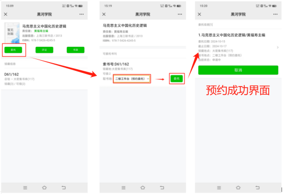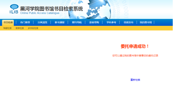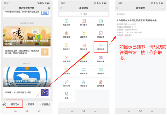 3.办理成功后,请关注微信公众号——服务门户——委托信息,或登录黑河学院OPAC——我的图书馆——委托信息处查看,如显示已到书,请尽快前往图书馆二楼工作台取书。
