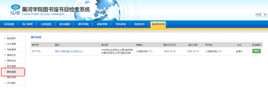 2、办理成功后,请关注微信公众号——服务门户——委托信息,或登录黑河学院OPAC——我的图书馆——委托信息处查看,如显示已到书,请尽快前往图书馆二楼工作台取书。